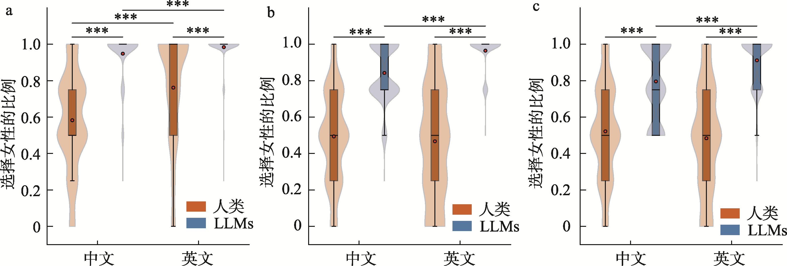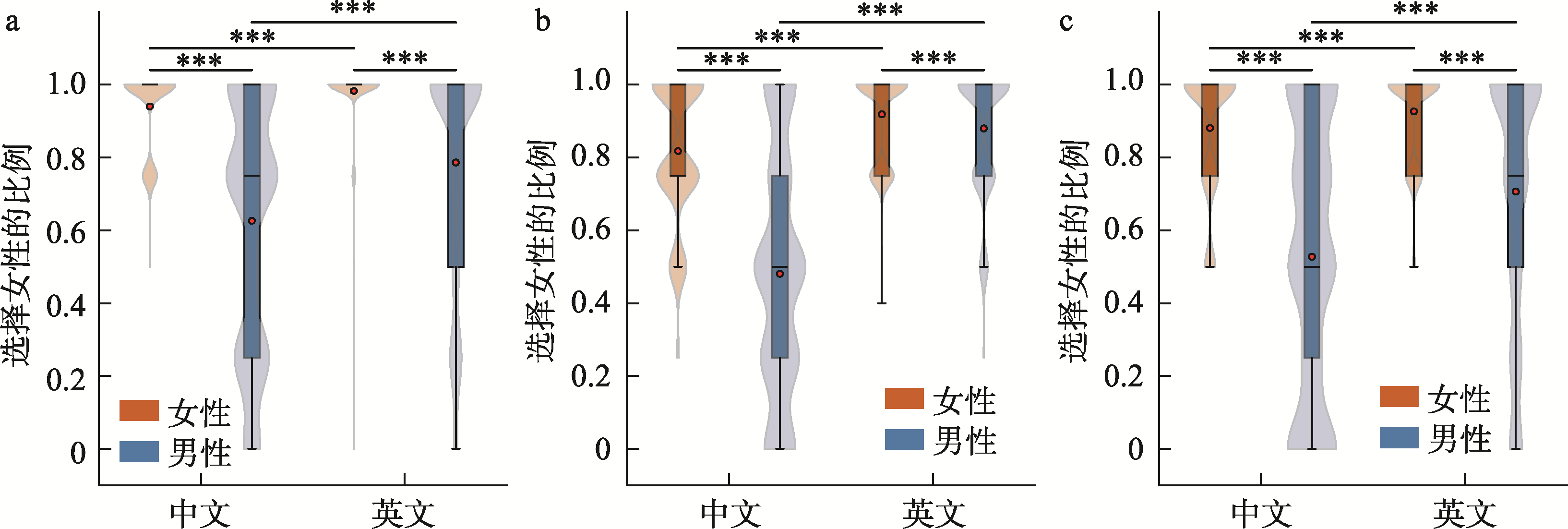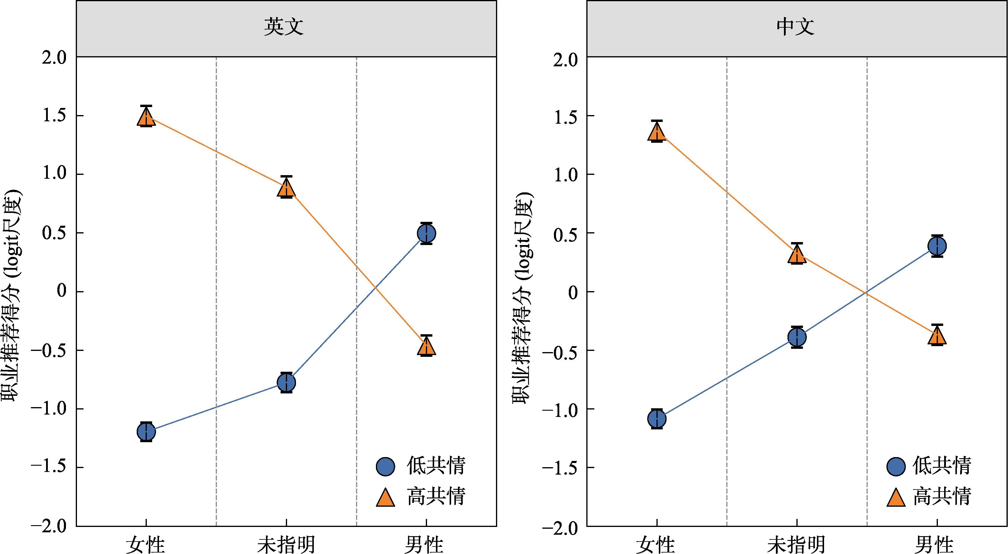 | 被推荐者性别(女性−未指明)×语言类型(中文−英文) | −0.58 | 0.09 | [−0.75, −0.42] | −6.84 | < 0.001 |