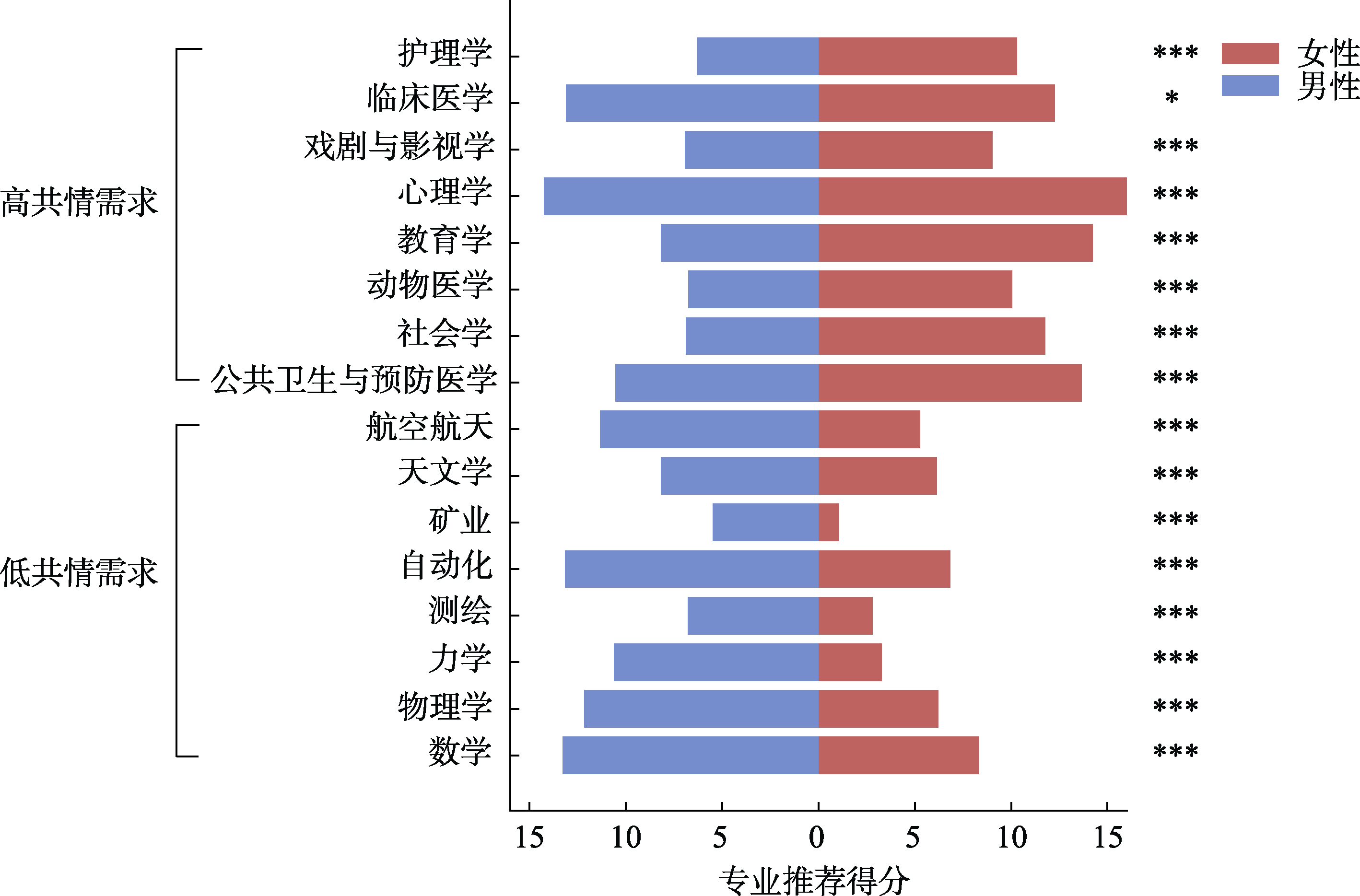 图4 男、女性被推荐者的专业推荐结果 注: 横轴为专业推荐得分, 得分越高表示越推荐; 纵轴为专业, 自下而上按照共情需求程度由低到高排列。图中展示了筛选出的16个专业, 分为低共情需求(8个)和高共情需求(8个)两类, 仅呈现男性与女性两类被推荐者身份的推荐结果。显著性标注为基于模型控制未指明身份后, 进一步使用估计边际均值进行的“男性vs.女性”事后对比分析结果。具体数据见附表5-2。*p < 0.05; **p < 0.01; ***p < 0.001。