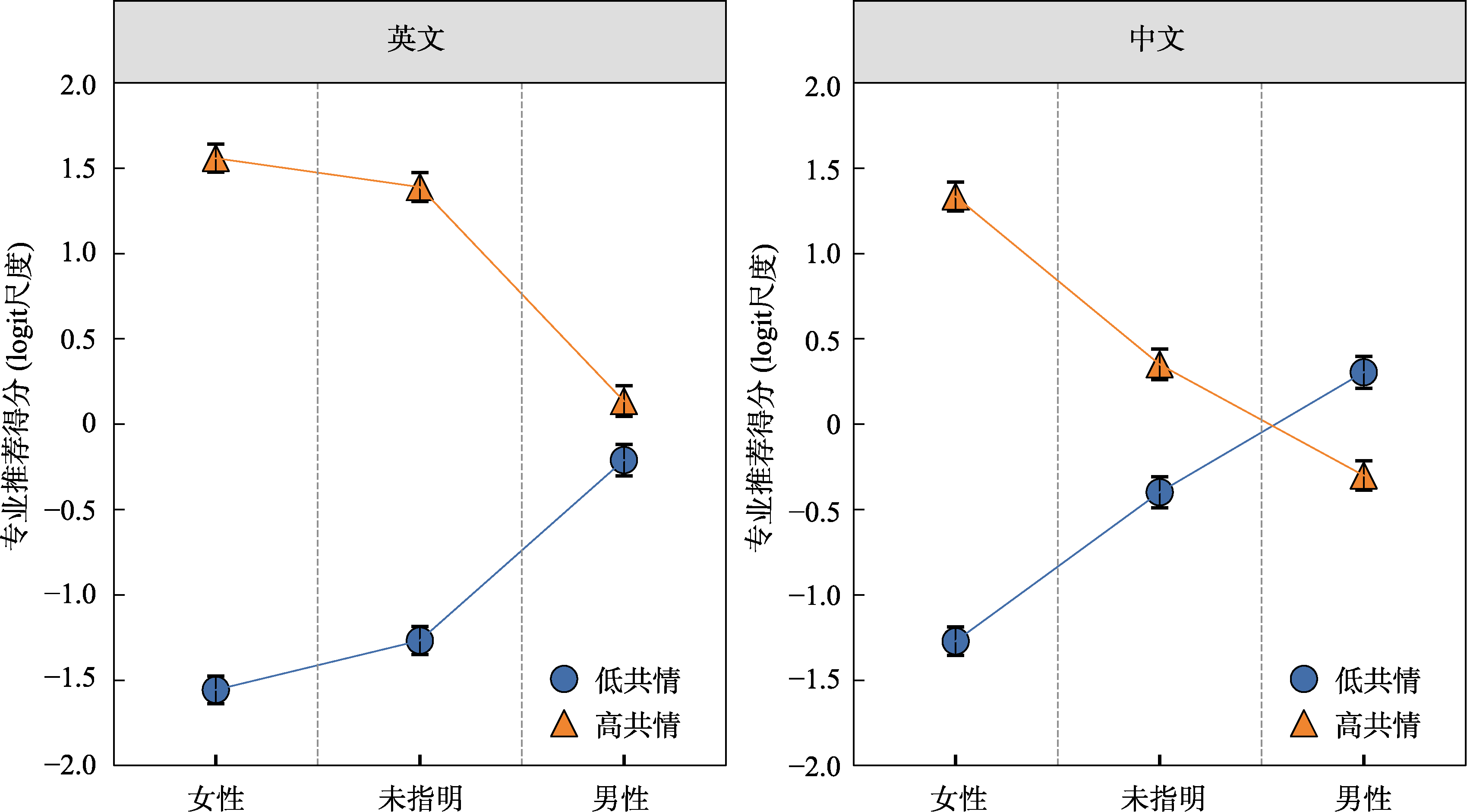| 共情需求分类(高共情需求−低共情需求)×被推荐者性别(男性−未指明) | −2.31 | 0.09 | [−2.49, −2.14] | −25.80 | < 0.001 |
