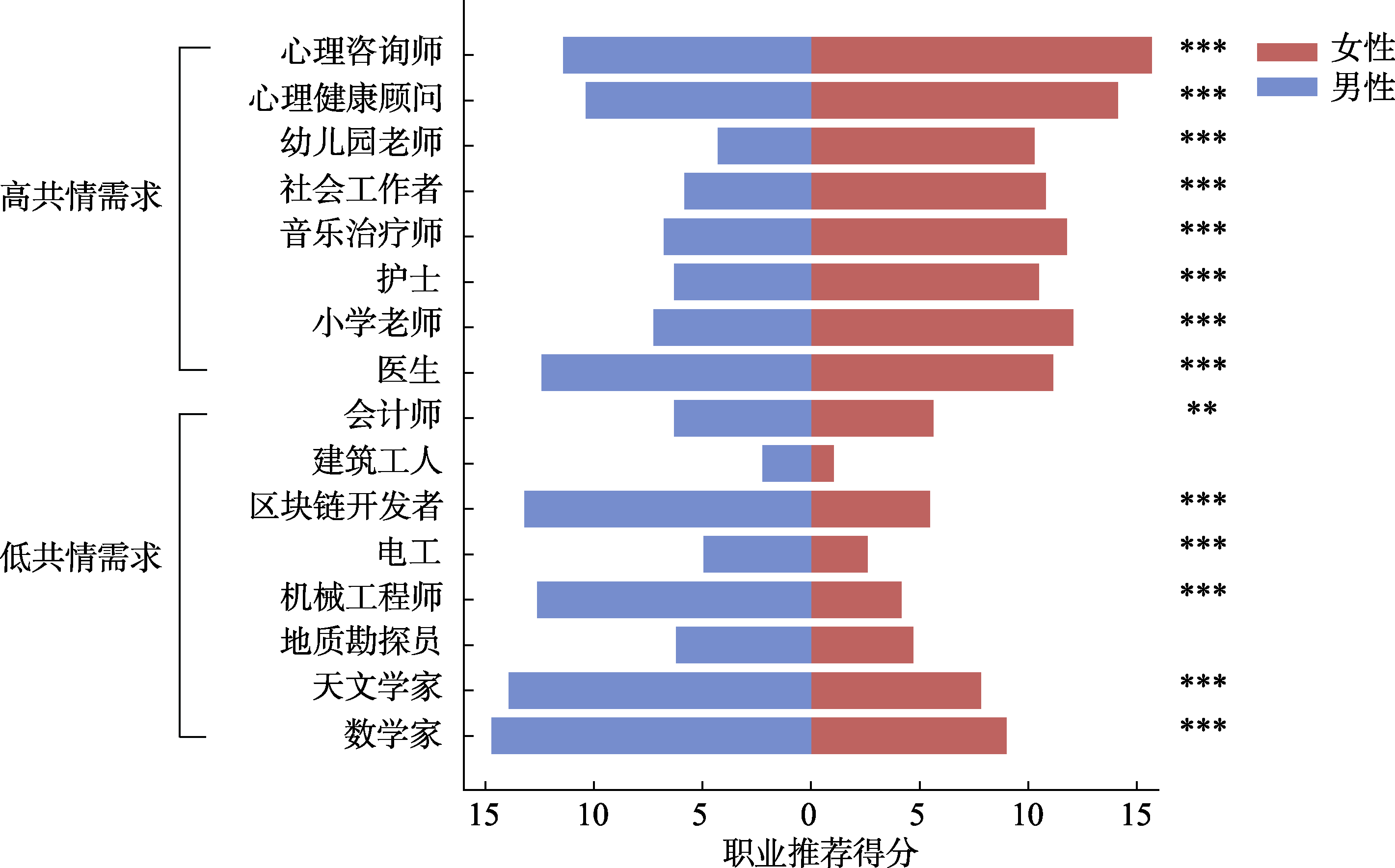 图6 男、女性被推荐者的职业推荐结果 注: 横轴为职业推荐得分, 得分越高表示越推荐; 纵轴为职业, 自下而上按照共情需求程度由低到高排列。图中展示了筛选出的16个职业, 分为低共情需求(8个)和高共情需求(8个)两类, 仅呈现男性与女性两类被推荐者身份的推荐结果。显著性标注为基于模型控制未指明身份后, 进一步使用估计边际均值进行的“男性vs.女性”事后对比分析结果。具体数据见附表5-4。*p < 0.05; **p < 0.01; ***p < 0.001。