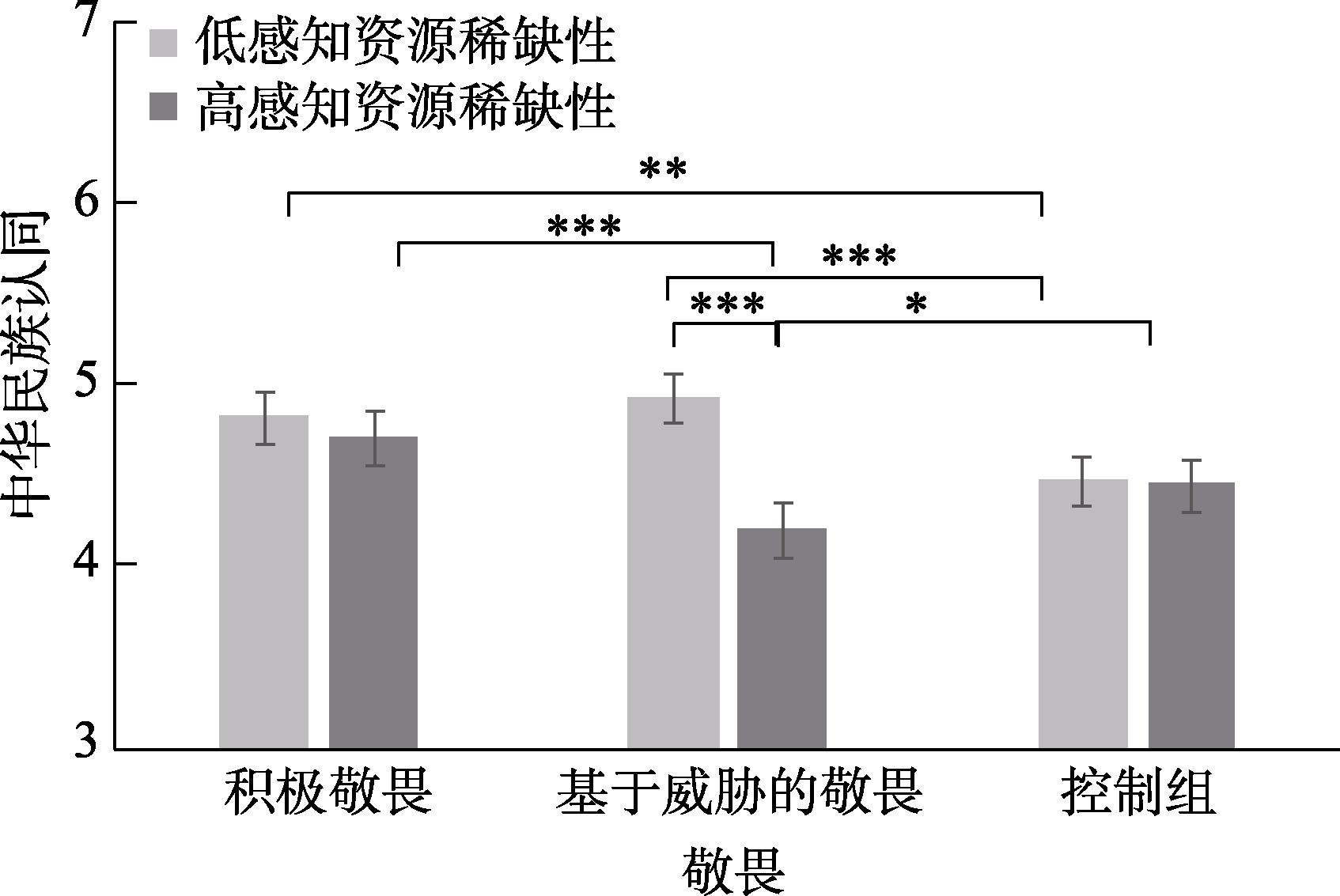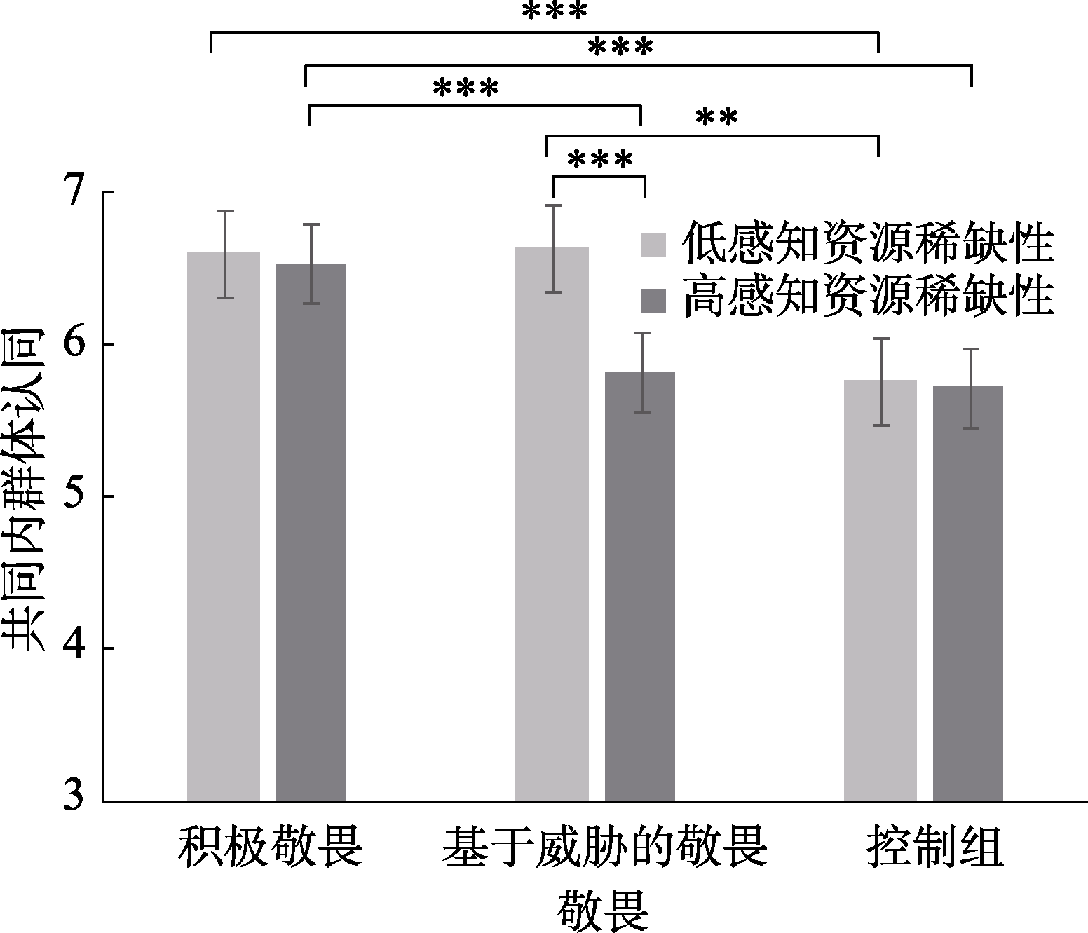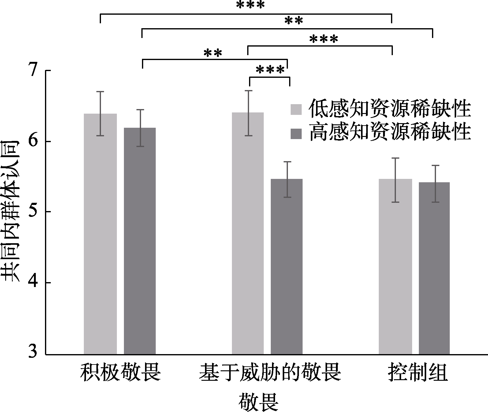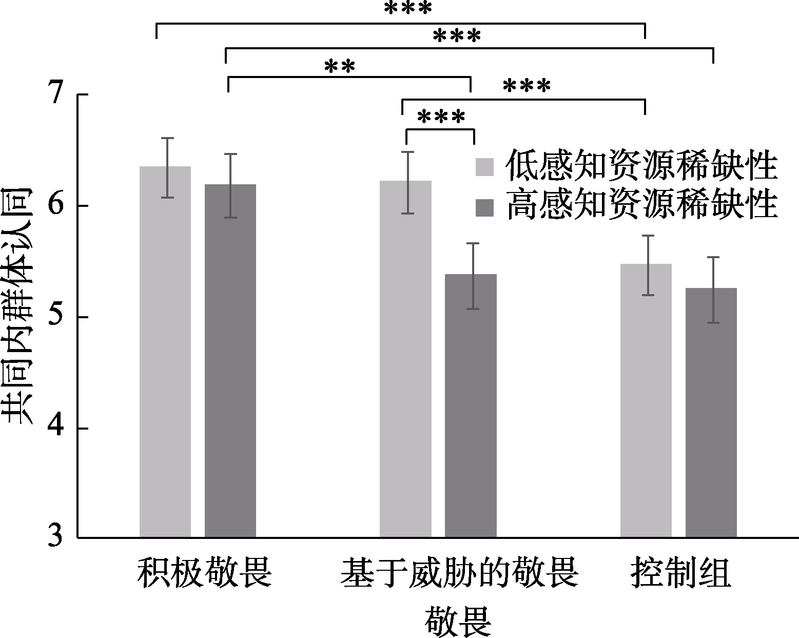 共同内群体认同是指赋予两个原本独立的群体一个上位身份, 使群体成员的认知表征由两个子群体变成一个共同内群体, 把对内群体成员的积极情感延伸到原外群体成员中, 有利于改善群际关系、增强凝聚力。面对复杂的国际环境, 团结是民族发展的重要力量, 因此如何提升共同内群体认同对民族发展至关重要。文章通过问卷调查(研究1)和操纵敬畏、感知资源稀缺性(研究2~4)探讨了敬畏对共同内群体认同的影响及作用机制。结果发现高感知资源稀缺性削弱了特质敬畏对共同内群体认同的影响(研究1), 并且调节了基于威胁的敬畏与共同内群体认同的关系(研究2~4), 即高感知资源稀缺性抑制了基于威胁的敬畏对共同内群体认同的促进效应。该结果启示我们可以通过增强敬畏, 尤其是积极敬畏来提升群体凝聚力。