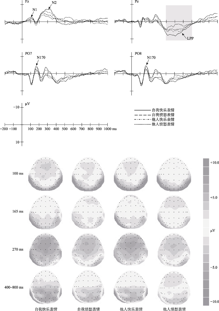 ERP数据结果表明, 自我表情比他人表情诱发更大的N1、N2、LPP成分, 且快乐表情比愤怒表情诱发更大的N1、N2、N170、LPP波幅和更短的N170潜伏期, 自我快乐表情激活的N1、N2、LPP波幅均显著大于自我愤怒表情和他人表情。