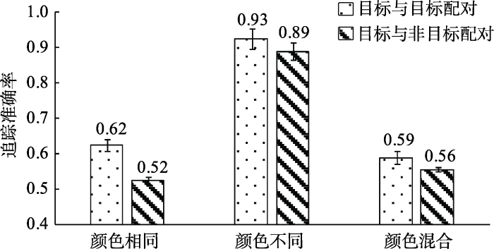 实验程序和参数基本同实验1。但每一试次都增加颜色作为表面特征, 且在运动结束时采用相同大小的黑色实心圆(30 pixel)进行遮蔽, 避免被试依赖记忆策略来进行选择。参与者先完成三种颜色组合下的目标与目标配对条件, 再完成三种颜色组合下的目标与非目标配对条件。在每种追赶条件中, 三种颜色组合均随机混合出现。每种组合条件重复20试次, 共完成120试次。整个实验时间持续约40分钟。实验程序将自动记录实验反应数据。