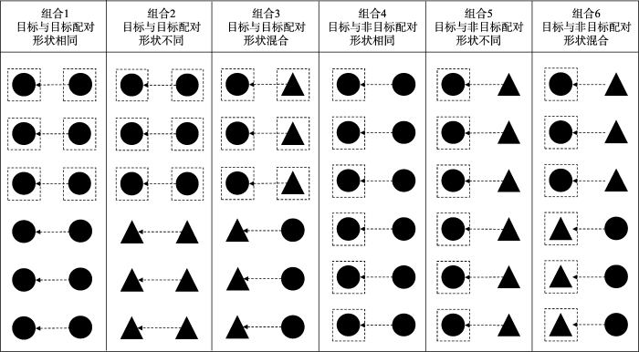 | 组合2 | 目标与目标配对 | 颜色不同 | 目标与目标配对追赶运动, 且目标为一种颜色, 非目标为另一种颜色 |
