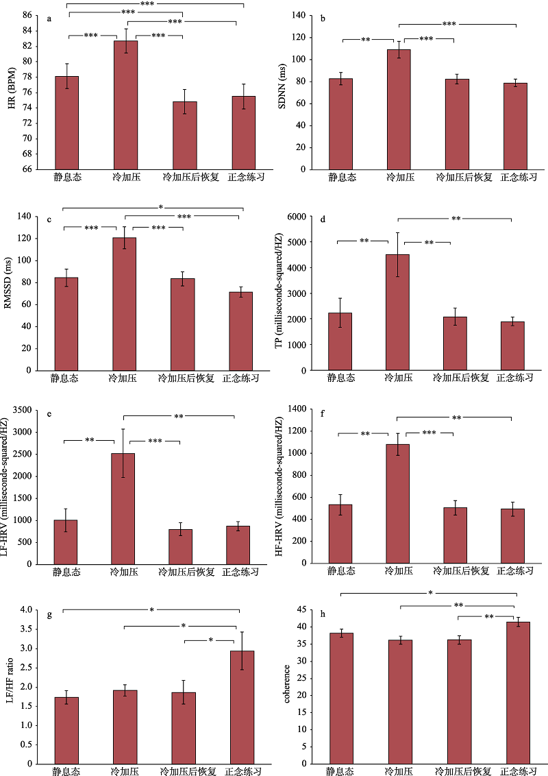 | 图3 HRV各指标在不同环节的重复测量方差分析结果 注:*表示p < 0.05, **表示p < 0.01, ***表示p < 0.001, 下同 |