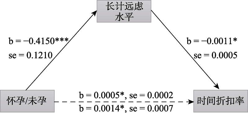 | 图1 研究1的中介分析结果 注:虚线之上的系数表示间接效应; 虚线之下的系数表示直接效应。怀孕编码, 1表示怀孕, 2表示未孕。*p ≤ 0.05, ***p ≤ 0.001 |