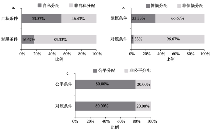 在自私条件下, 17.86% (5/28)的被试给出的分配为5 : 1, 即与前一自私分配者完全一样; 35.71% (10/28)的被试给出的分配为4 : 2, 在分配数量上并非完全一样, 但分配模式仍为自私分配; 46.43% (13/28)的被试给出的分配为3 : 3, 即未传递前一分配者的自私分配。在公平条件下, 6.67% (2/30)的被试给出的分配为5 : 1, 即为自私分配; 10.00% (3/30)的被试给出的分配为4 : 2, 也为自私分配; 80.00% (24/30)的被试给出的分配为3 : 3, 即与前一公平分配者完全一样; 3.33% (1/30)的被试给出的分配为2 : 4, 即为慷慨分配。在慷慨条件下, 6.67% (2/30)的被试给出的分配为5 : 1, 即为自私分配; 6.67% (2/30)的被试给出的分配为4 : 2, 也为自私分配; 53.33% (16/30)的被试给出的分配为3 : 3, 即未传递前一分配者的慷慨分配; 13.33%(4/30)的被试给出的分配为2 : 4, 在分配数量上并非与前一分配者完全一样, 但分配模式仍为慷慨分配; 16.67% (5/30)的被试给出的分配为1 : 5, 即与前一慷慨分配者完全一样; 3.33%(1/30)的被试给出的分配为0 : 6, 即比前一慷慨分配者更慷慨。为了进一步探究资源分配模式的传递效应, 我们将三个实验条件下传递者与非传递者所占比例分别与对照条件进行比较。对于自私条件和对照条件, 被试分配的数量小于3, 则记为自私分配模式; 分配的数量大于或等于3, 则记为非自私分配模式。卡方检验(Chi-square test)的结果显示, 自私条件下被试的自私分配模式所占比例(53.57%)显著高于对照条件(16.67%), χ2(1) = 8.73, p = 0.003, φ = 0.39 (如图1.a所示)。对于慷慨条件和对照条件, 被试分配的数量大于3, 则记为慷慨分配模式; 分配的数量小于或等于3, 则记为非慷慨分配模式。慷慨条件下被试的慷慨分配模式所占比例(33.33%)显著高于对照条件(3.33%), χ2(1) = 9.02, p = 0.003, φ = 0.39 (如图1.b所示)。对于公平条件和对照条件, 被试分配的数量为3, 则记为公平分配; 分配的数量不等于3, 则记为非公平分配。公平条件下公平分配比例(80.00%)与对照条件中公平分配比例(80.00%)之间没有显著差异, χ2(1) = 0.00, p = 1.000, φ = 0.00(如图1.c所示)。进一步比较自私条件下传递者和非传递者所占比例是否和慷慨条件之间存在差异。卡方检验的结果显示, 自私分配的传递比例(53.57%)与慷慨分配的传递比例(33.33%)之间没有显著差异, χ2(1) = 2.42, p = 0.120, φ = 0.20。