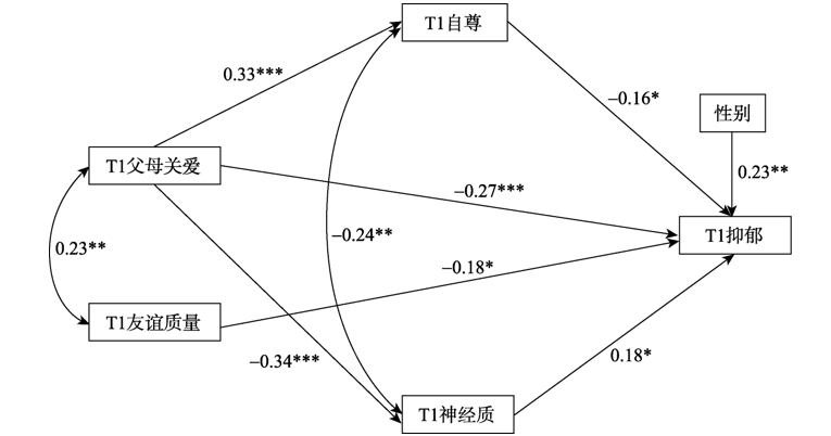 | 图3 父母关爱对留守儿童抑郁的即时影响模型(图中数字为标准化路径系数, 下同) |