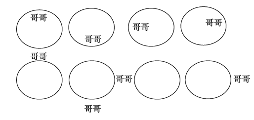 采用E-prime 2.0系统编程。为了避免注意焦点转移影响, 词在屏幕中央呈现, 圆圈随机出现在屏幕的上、下、左、右处, 但各种位置机会均等。亲属词与圆圈的位置有8种组合:词在圆圈内偏上、偏下、偏左、偏右处, 词在圆圈外偏上、偏下、偏左、偏右位置处(见图1)。