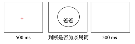 被试坐在计算机前, 双手的食指放在F键和J键上。软件自动记录被试的反应时和错误率。首先, 在屏幕中央呈现注视点“+” 500 ms, 接着在屏幕中央呈现目标词, 同时圆圈在不同位置随机出现。被试按键后(最长不超过3000 ms), 进入500 ms空屏。告知被试忽略圆圈, 又快又准地判断词是否为亲属词。如果是, 按下F键; 如果不是, 按下J键。半数被试的用手按此规定, 半数被试的用手规定相反。实验材料采取伪随机顺序呈现。同类材料(亲属词、非亲属词)连续出现次数不超过两次。实验流程见图2。在正式实验前, 用非实验材料做了16次练习。实验包含480个试次, 每一词语出现8次。每隔160个试次, 被试休息一次。