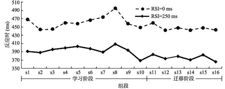 RSI = 0 ms、250 ms各组段反应时变化曲线图