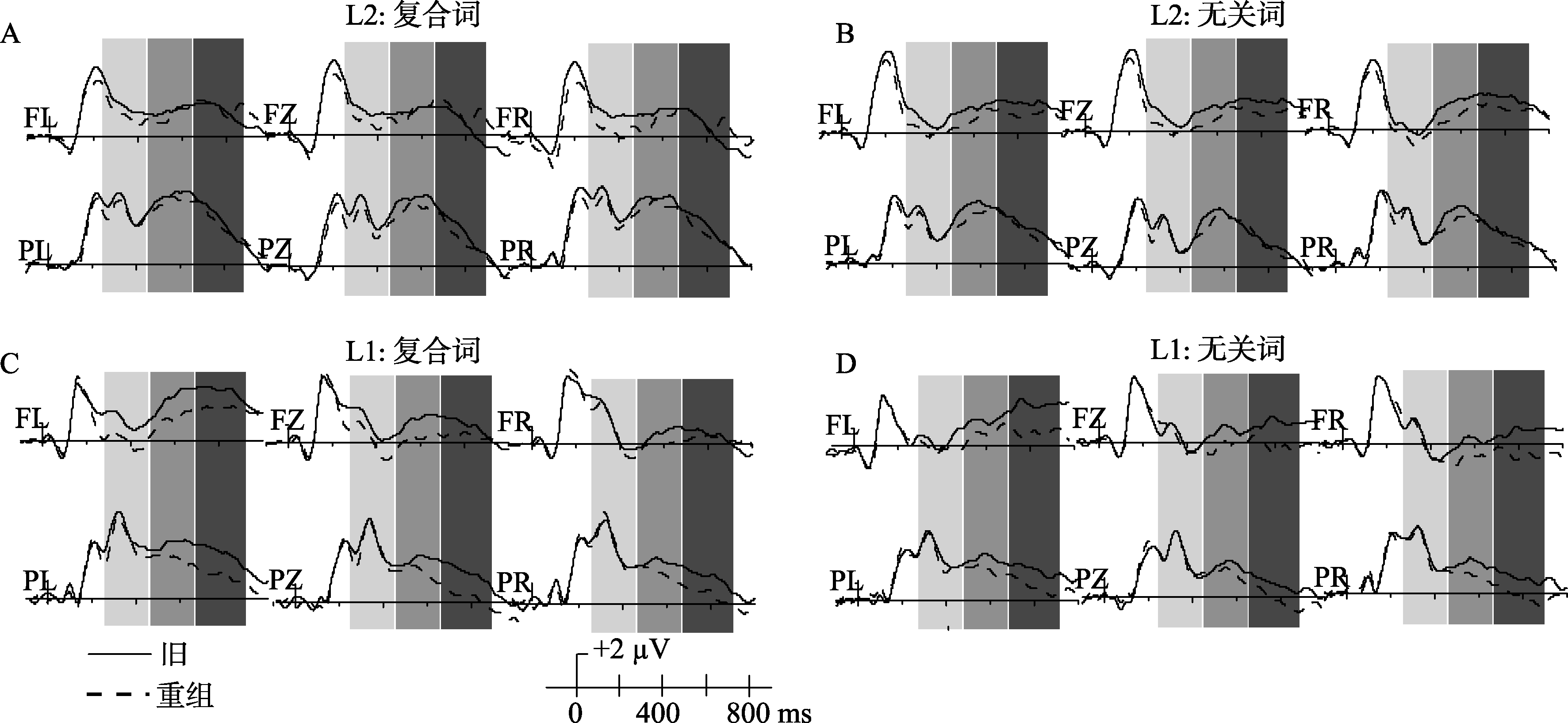 | 图3 旧/重组反应在各电极的平均振幅 注:A、B分别为双语者在L2(汉语)复合词和无关词上的旧/重组反应在各电极的平均振幅; C、D分别为双语者在L1(维吾尔语)复合词和无关词上的旧/重组反应在各电极的平均振幅。其中, FL为F1和F3振幅的均值, FR为F2和F4振幅的均值; PL为P1和P3振幅的均值, PR为P2和P4振幅的均值。时间进程为-100~1000 ms, 时段为250~450 ms、450~650 ms和650~900 ms。 |