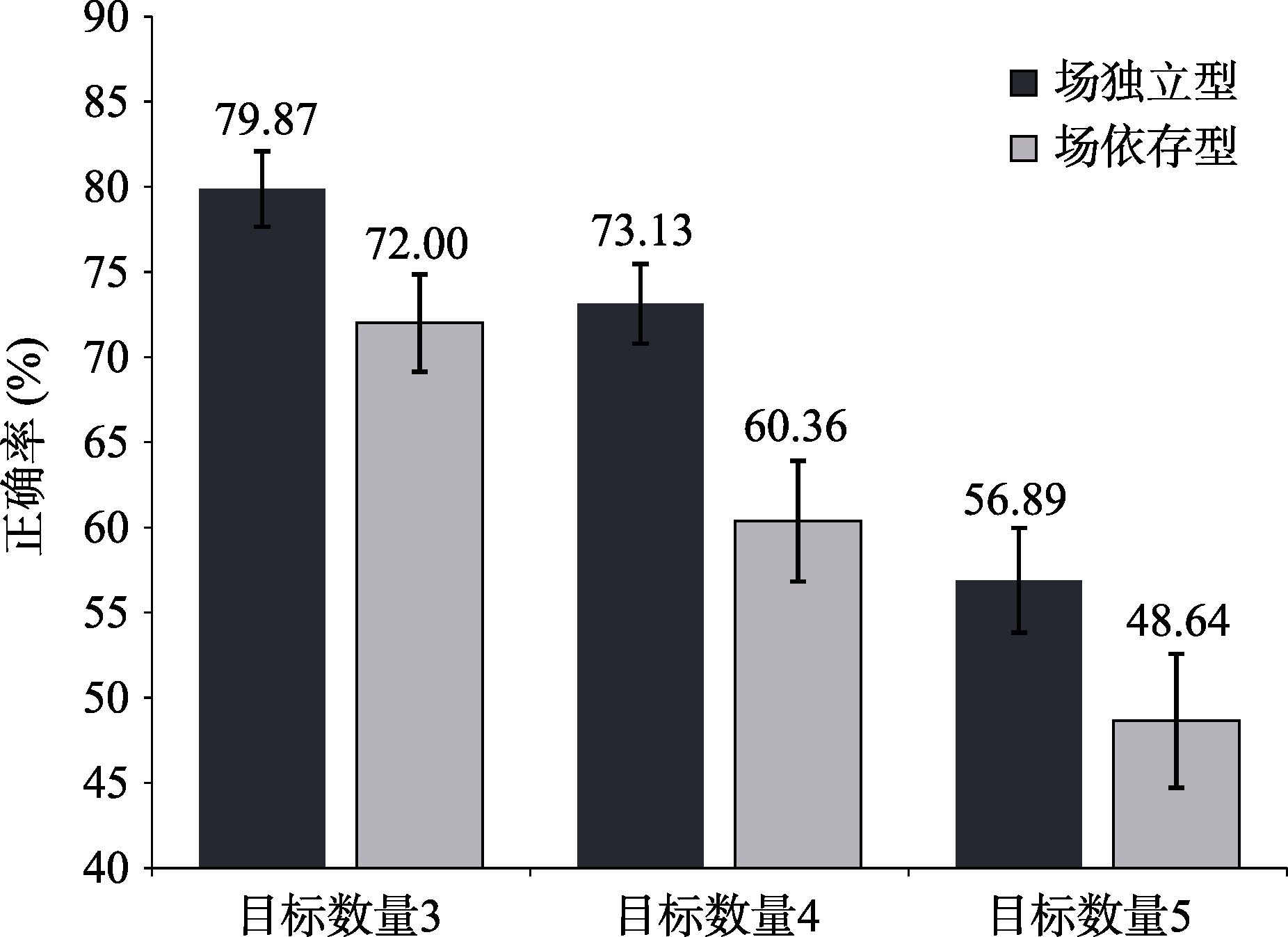 | 图2 两种场认知风格类型不同目标数量经典多目标追踪正确率(误差线为标准误) |