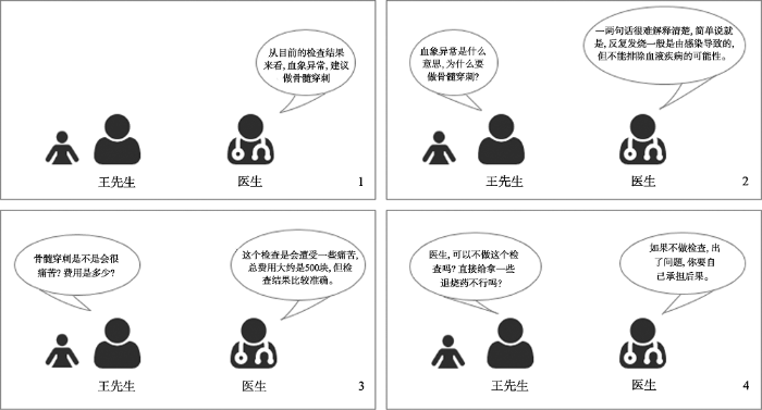 医患对白部分为使被试更好的进入医患互动情境以及减轻阅读负担, 采用漫画和文字组合的形式, 见图1。
