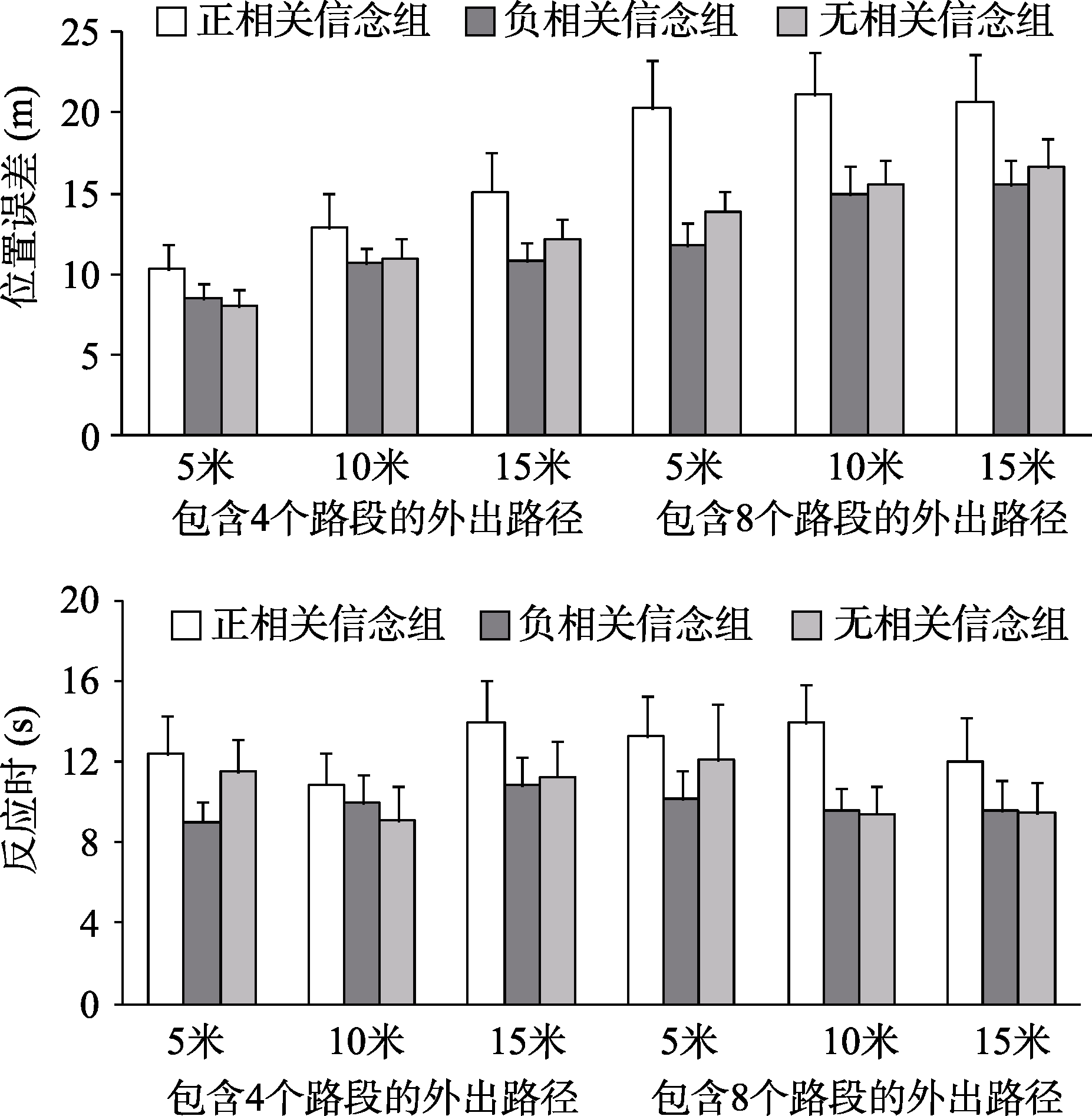 不同路段个数和正确返航距离的外出路径的平均位置误差和反应时