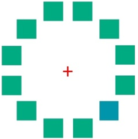 在计算机中将所选色块制作为像素为160×160颜色块, 每次选择两个色块制作成实验刺激, 样例如图2所示。任务是色环搜索, 要求被试在含有12个色块的圆环内找出1个与其它11个颜色不同的色块。在12个色块中, 11个是相同颜色(干扰刺激), 只有1个与其它颜色不同(目标刺激)。4个色块有6种目标刺激和干扰刺激的组合方式:(1)范畴内且色差为1级的组合有2个:蓝色/偏蓝色、绿色/偏绿色; (2)范畴间且色差为1级的组合有1个:偏蓝色/偏绿色; (3)范畴间且色差为2级的组合有2个:蓝色/偏绿色, 绿色/偏蓝色; (4)范畴间且色差为3级的组合有1个:蓝色/绿色。每个组合里两种颜色可以互为目标刺激和干扰刺激。即, 4个色块有12种组合。目标刺激在12个位置上各出现1次, 组成12×12共144个色环组合作为实验刺激。实验时, 144个刺激随机呈现。