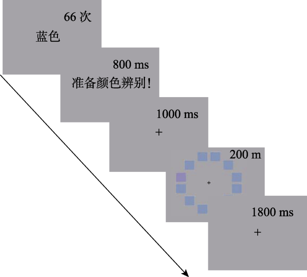 30名被试, 8男22女, 年龄18~23岁, 平均21岁, 标准差1.37岁, 均为右利手, 视力或矫正视力正常, 无色盲、色弱, 未参加过类似实验。实验后给予一定报酬。首先要求被试对实验中使用的颜色块材料进行命名, 6种颜色块各呈现6次, 共36个试次, 最多允许错误1个。27名符合要求的被试进入正式实验。
