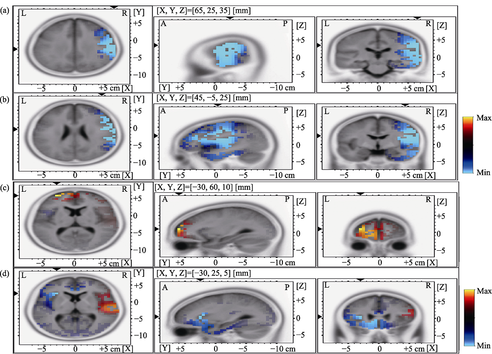 | 图4 对中性意图与友好、敌对意图条件下的N250进行溯源分析的最大抑制脑区分别为BA6区(a)和BA2区(b); 对友好意图和敌对意图两种条件下N250和P300进行溯源的最大激活脑区分别位于BA10区(c)和BA45区(d) |