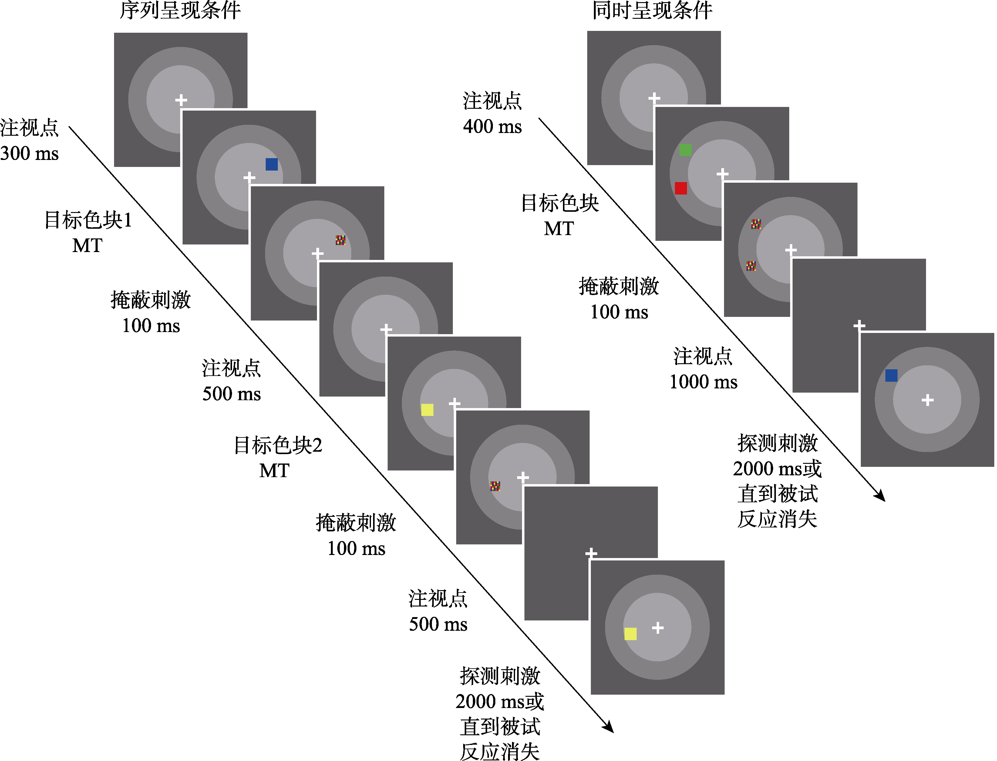 显示实验1主任务流程图, 图中分别为序列呈现(左)与同时呈现(右)的情况