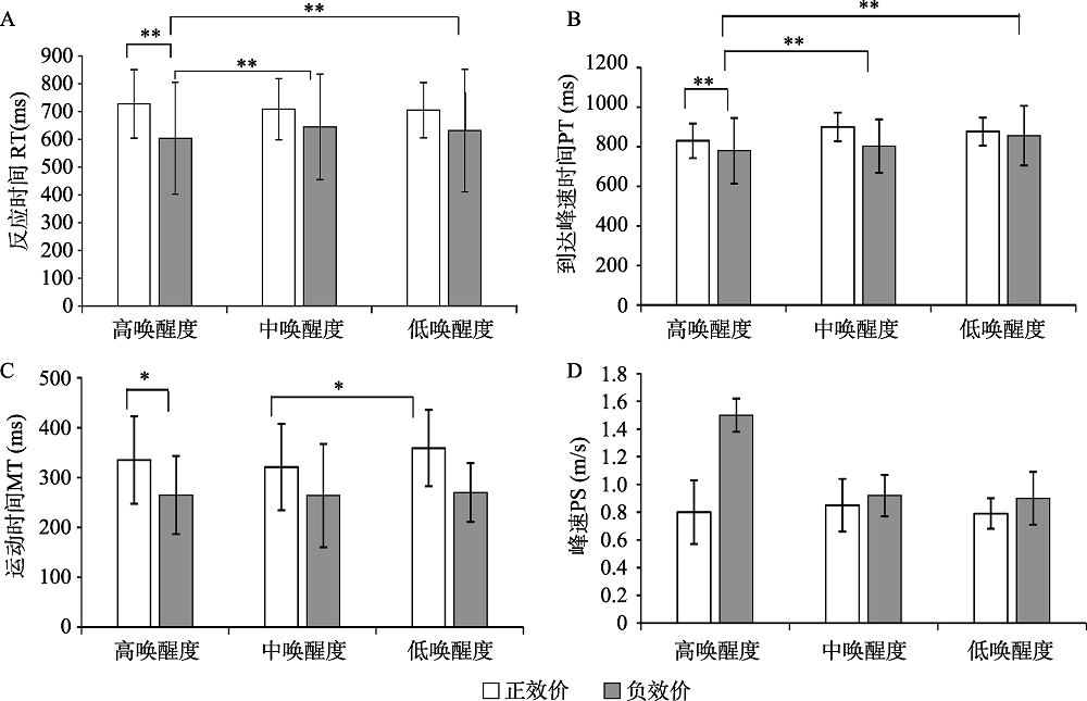 实验1向上拖动正、负效价图片在反应时、到达峰速时间、运动时间和峰速上均值的比较