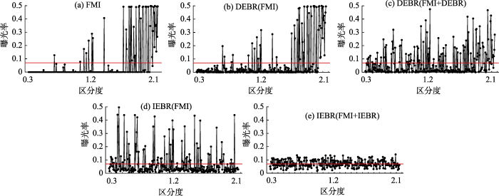 考察真实题库中所有题目的曝光率在两轮迭代内的变化, 可以更加明显地发现这一变化与答题者调用率的变化具有一致性。FMI生成首批数据时(见图1, 红色横线表示完全均匀的理想曝光率${{r}_{ideal}}=\frac{L}{K}=0.072$), DEBR发生精度曝光率权衡的幅度较小(图1b), 第一轮选题结果更接近FMI (图1a), 更容易在已有作答数据中找到相似答题者, 因而答题者调用率的值更高; 而IEBR会选出更多不常用的题目, 改善曝光的幅度较大(图1d), 也使得选题时相似答题者数量大幅减少, 答题者调用率的值较低。合并数据进行第二轮选题时, 两种策略都在原有基础上改善曝光控制(图1c和1e), 调用率以同等幅度降低, 数值的大小与优化曝光率的最终结果相互匹配。同理可以解释BAS生成首批数据时的情况(见图2), 第一轮选题两种推荐策略的权衡趋势和答题者调用率都十分接近(图2b和2d), 由于BAS有一定的曝光控制能力(图2a), DEBR和IEBR的调用率都位于FMI条件下两种推荐策略的中间水平。第二轮选题DEBR基本达到了其优化曝光的上限(图2c), 调用率变化甚微, IEBR仍在明显改善题库使用的均匀程度(图2e), 调用率再度降低。由此可见, 答题者调用率可以视作推荐策略选题特点和权衡趋势的侧面衡量指标。