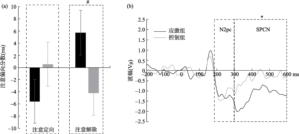 | 图3 注意偏向分数(a)和对威胁刺激的反应的ERP结果(b) 注:#表示p < 0.1, *表示p < 0.05 |