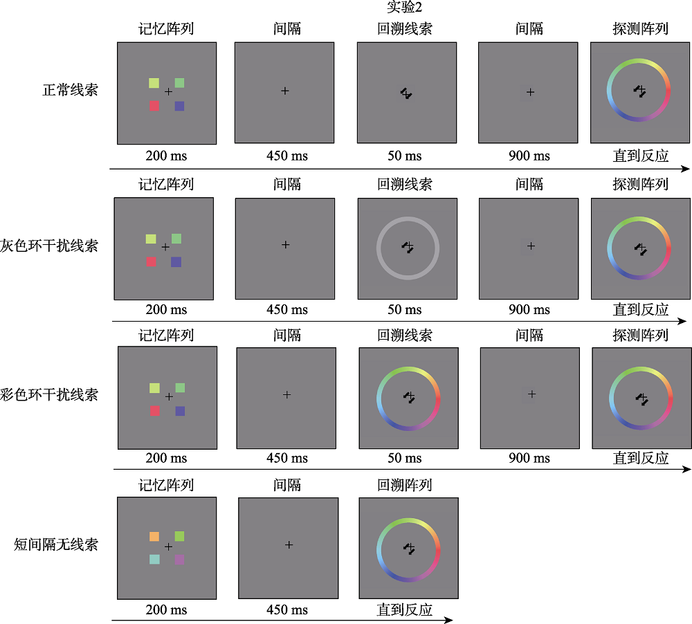 | 图3 实验2流程图。图中分别为正常线索条件、灰色环干扰线索条件、彩色环干扰线索条件以及短间隔无线索条件。 |