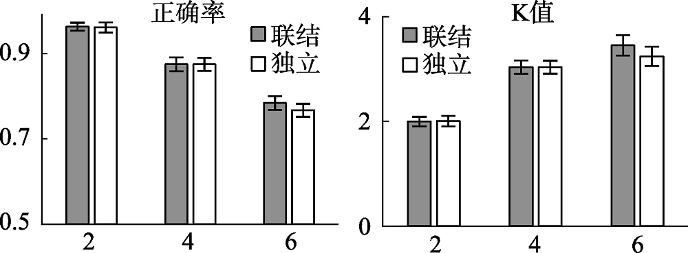 | 图4 实验2行为结果图。记忆项目数为2、4、6项时, 联结、独立两种条件下的正确率(左)与记忆项目数为4、6时, 联结、独立两种条件下的记忆容量K值。 |