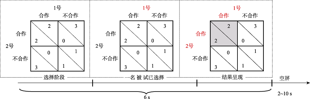 | 图1 实验流程示意图。在图中所示的试次中, 1号被试先于2号被试按键选择, 故1号被试对应的编号先变成红色。 |