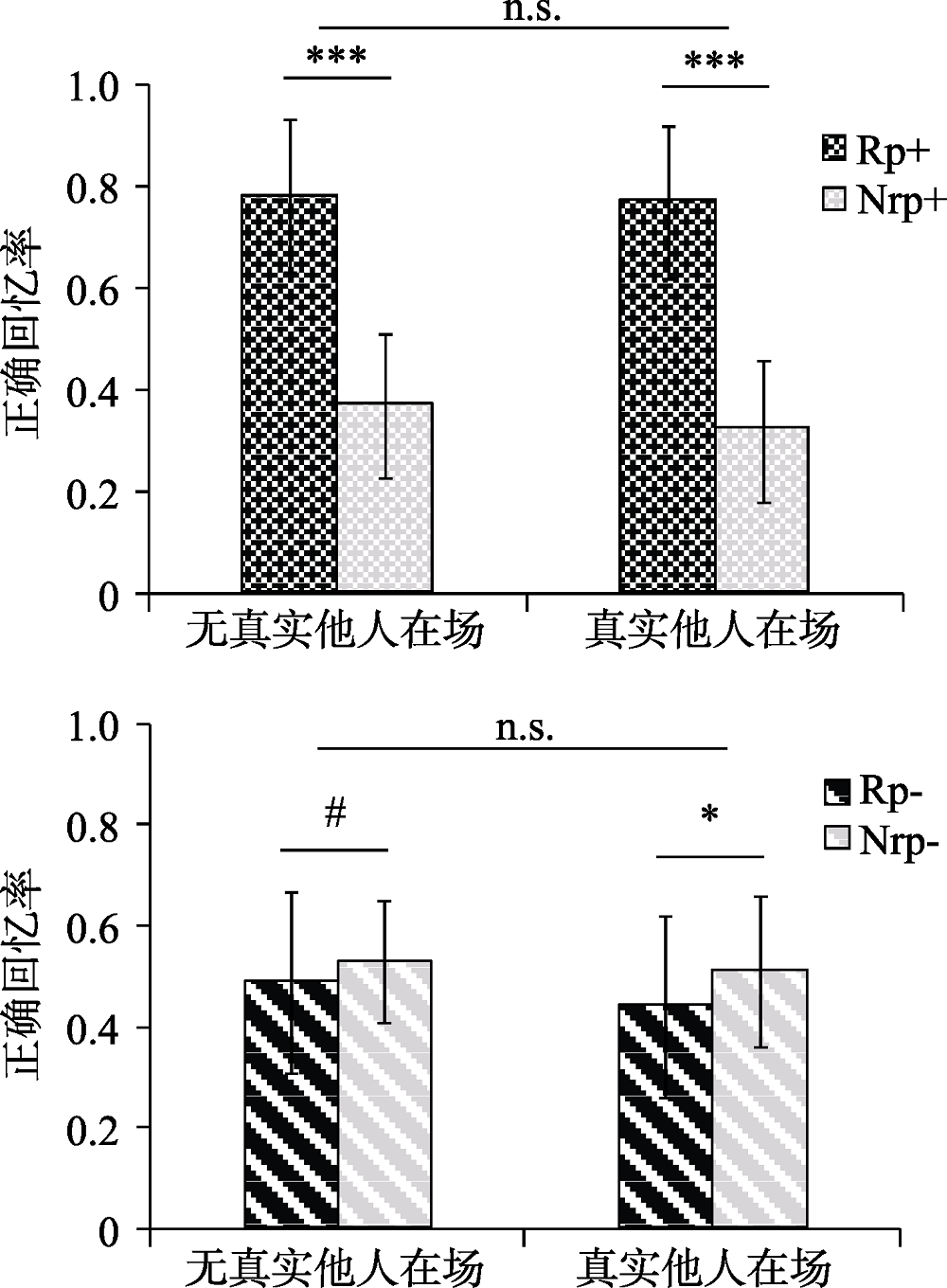 | 图2 不同实验条件下说者Rp+、Nrp+、Rp-和Nrp-项目的正确回忆率 注:# p = 0.067; * p < 0.05; ** p < 0.01; *** p < 0.001, 以下同。 |