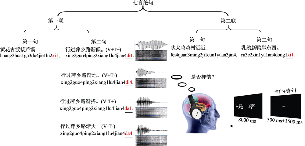 | 图1 实验材料各条件举例及实验流程。V+T+:韵母合适、声调合适; V+T-:韵母合适、声调违反; V-T+:韵母违反、声调合适; V-T-:韵母违反、声调违反 |