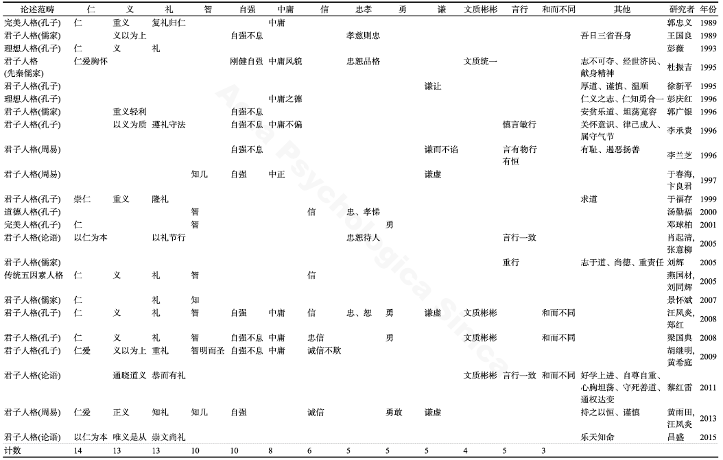 表1 近30年来国内主要期刊中的文献所提出的君子人格结构要素