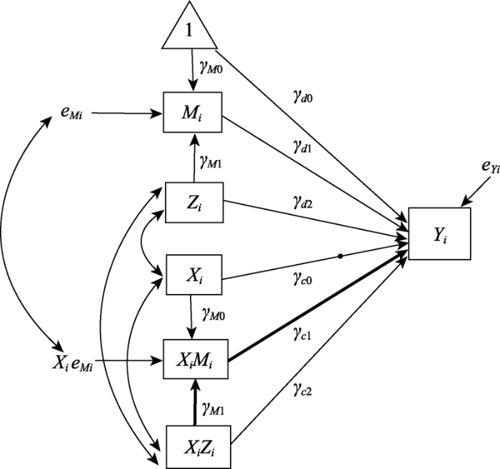 图3中X到Y路径系数上的实心圆点表对应的回归系数含有随机效应${{u}_{ci}}$, 用以描述Y的残差方差可以随X的变化而变化(方差非齐性), 传统meMO模型中不包含这项。2meMO模型允许包含随机项${{u}_{ci}}$不仅不再需要误差齐性的假设, 而且更符合实际情况。因为除了模型中考虑到的调节变量, X和Y之间的关系还有可能依赖于模型中没包含的其他调节变量, X对Y影响的随机误差项${{u}_{ci}}$也合理的刻画了这一点。除了这一随机路径, 该模型与传统的meMO对应的统计模型(Grant & Berry, 2011; Liu et al., 2012)相比, 传统模型中$XZ\to XM$和$X\to XM$的路径自由估计, 而在我们推导的统计模型中这两条路径分别限定为与Z对M回归的斜率和截距相等, 对于模型的自由度增加了2。除了随机效应${{u}_{ci}}$外, 虽然2meMO对应合并统计模型中的其他部分与Kwan和Chan (2018)从另一视角推导的meMO的统计模型相同, 但两者建构和解释meMO影响效应的思路存在本质差异。2meMO分层统计模型(图2)与概念模型的对应关系更清晰, 模型中关于X和Y之间关系变异的解释也更易于理解, 可以围绕X和Y之间关系变异(ci)的解释, 定义调节变量Z的总调节效应、直接调节效应以及间接调节效应, 而且这一定义效应量的思路同样适用于${{u}_{ci}}=0$的模型。