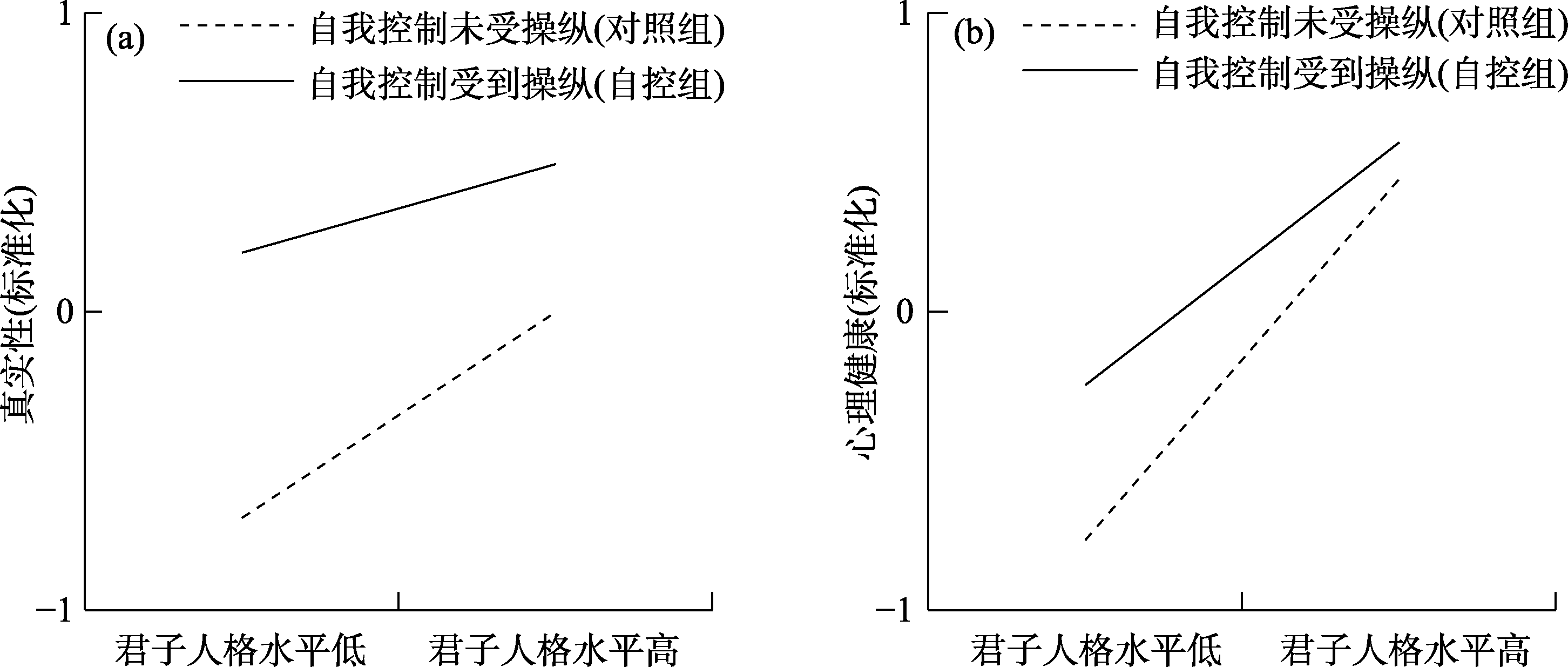 | 图3 人为控制自我控制后, 君子人格对真实性和心理健康的效应减弱(研究2) |