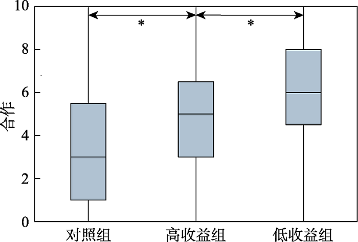 不同性别(t = 0.83, p = 0.408)和专业(F = 1.54, p = 0.204)下合作水平的差异不显著, 年龄与合作水平(r = -0.03, p = 0.597)的相关系数不显著。运用单因素方差分析比较三组被试的合作水平, 结果显示, 三组被试的合作水平存在显著差异(F = 15.24, p < 0.001, d = 0.65, 95% CI = [0.38, 0.92])。多重比较(Tukey法)的结果表明:高收益组被试(M = 4.75, SD = 2.57, n = 84)的合作水平显著高于对照组(M = 3.55, SD = 2.80, n = 84) (p= 0.012, 95% CI = [0.22, 2.19]), 而低收益组被试(M = 5.86, SD = 2.76, n = 84)的合作水平显著高于对照组(p< 0.001, 95% CI = [1.32, 3.30])和高收益组(p= 0.023, 95% CI = [0.12, 2.09])。图1直观地显示了三组被试合作水平的差异。