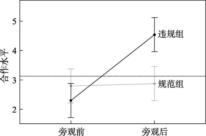 我们首先使用规范激活水平的第一种操作定义进行了统计分析, 结果发现, 不同性别(t = 0.45~1.51, p = 0.133~0.652)和专业(F = 0.08~1.04, p = 0.374~0.972)下描述性规范、命令性规范和合作水平的差异均不显著, 年龄与描述性规范、命令性规范、合作水平(r = -0.05~-0.03, p = 0.420~0.602)的相关系数不显著。以分组(违规组、规范组)和轮次(旁观前、旁观后)做二因素混合设计的方差分析, 结果如表3所示:分组和轮次的主效应都显著, 两者的交互作用也显著。多重比较结果如图4所示, 违规组被试在旁观惩罚行为后的合作水平(M = 4.54, SD = 2.59, n = 80)显著高于旁观前水平(M = 2.30, SD = 2.37, n = 80) (SE = 0.42, p < 0.001, 95% CI = [1.42, 3.06]), 也显著高于规范组旁观后水平( M = 2.87, SD = 2.73, n = 80) (SE = 0.42, p < 0.001, 95% CI = [0.85, 2.49]); 规范组旁观前( M = 2.80, SD = 2.82, n = 80)和旁观后无显著差异(SE = 0.42, p = 0.855, 95% CI = [-0.90, 0.74]); 旁观前两组也无显著差异(SE = 0.42, p = 0.235, 95% CI = [-0.32, 1.31])。上述结果表明旁观惩罚行为显著提升了旁观者的合作水平, 也就是说, 惩罚提升合作的效应的确能溢出到旁观者身上, 并且这种溢出效应并非是重复测量引起, 因为规范组旁观前后合作水平并无显著变化。这为研究问题3提供了肯定的回答。