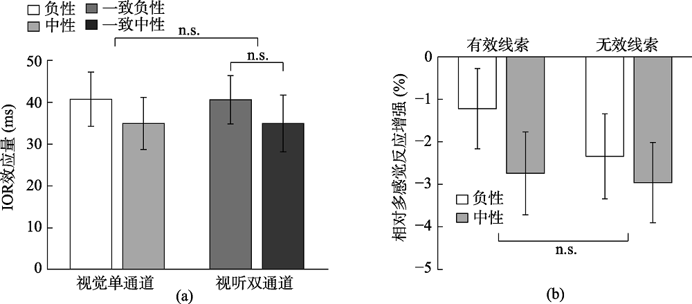 | 图5 (a) 各个条件下的IOR效应量(RT有效–RT无效), (b) 各个条件下的相对多感觉反应增强(rMRE) (注:n.s. p > 0.05) |