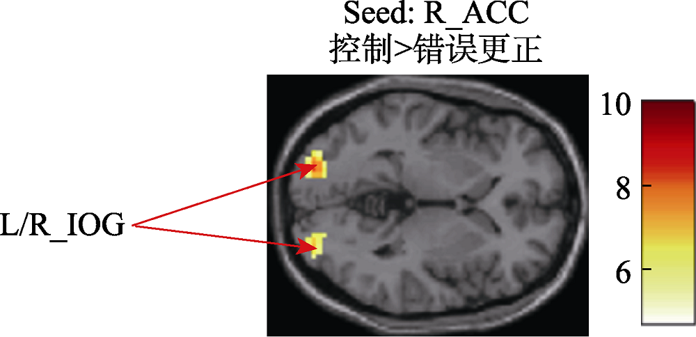 | 图6 以右侧前扣带回为种子点的功能连接激活图(ACC = 前扣带回; IOG = 枕下回; L = 左侧; R = 右侧) |