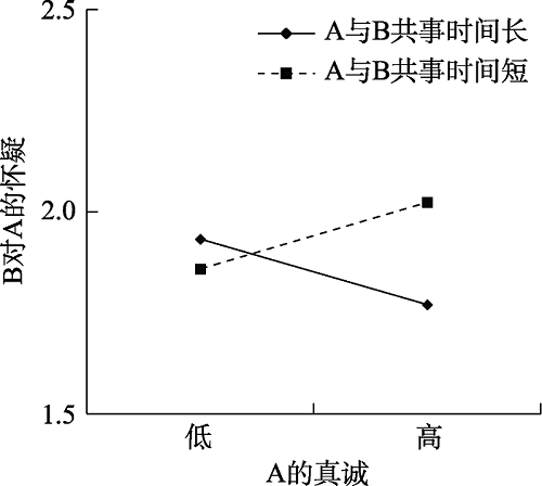| 图2 A与B的共事时间在A的真诚与B对A的怀疑之间关系的调节效应(研究1) |