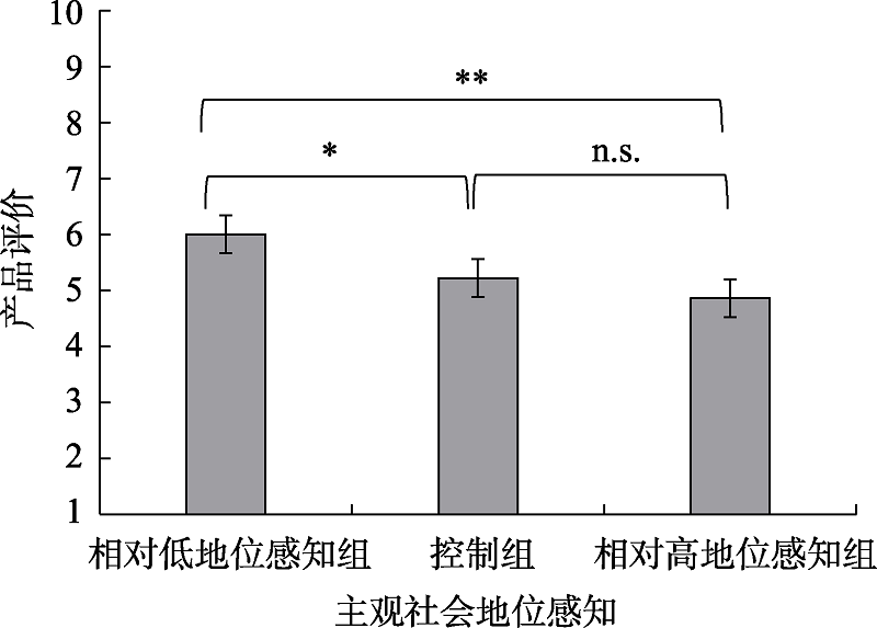 | 图2 主观社会地位对繁复设计偏好的影响示意图 注:* p < 0.05, ** p < 0.01, n.s. p > 0.05 |