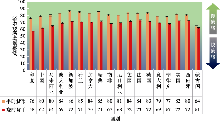 为了验证我们的推测, 我们在疫情期间选择亚非欧美大洋洲这五大洲共计18国的居民作为取样对象。本研究测量了自评的扛疫成效, 以及居民在不同时期和对不同通货跨期选择偏爱的程度并换算成了跨期选择策略的变易程度。