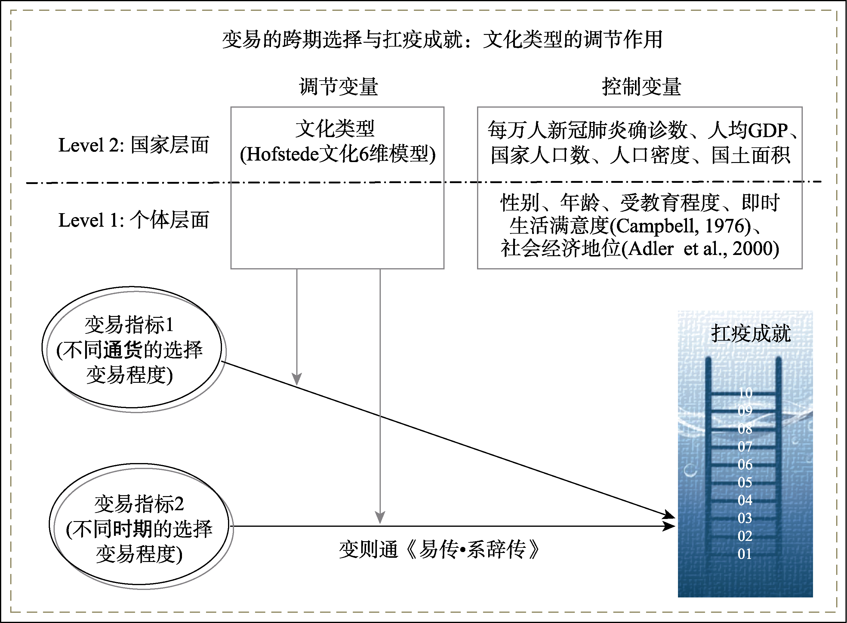 | 图1 研究变量与整体假设模型:某特定文化群体在疫情危机中, 变通而图存; 该文化群体跨期选择的变易(系辞谓之“变”)程度越大、越可能取得“扛疫成就”而脱离苦海(系辞谓之“通”)。 |