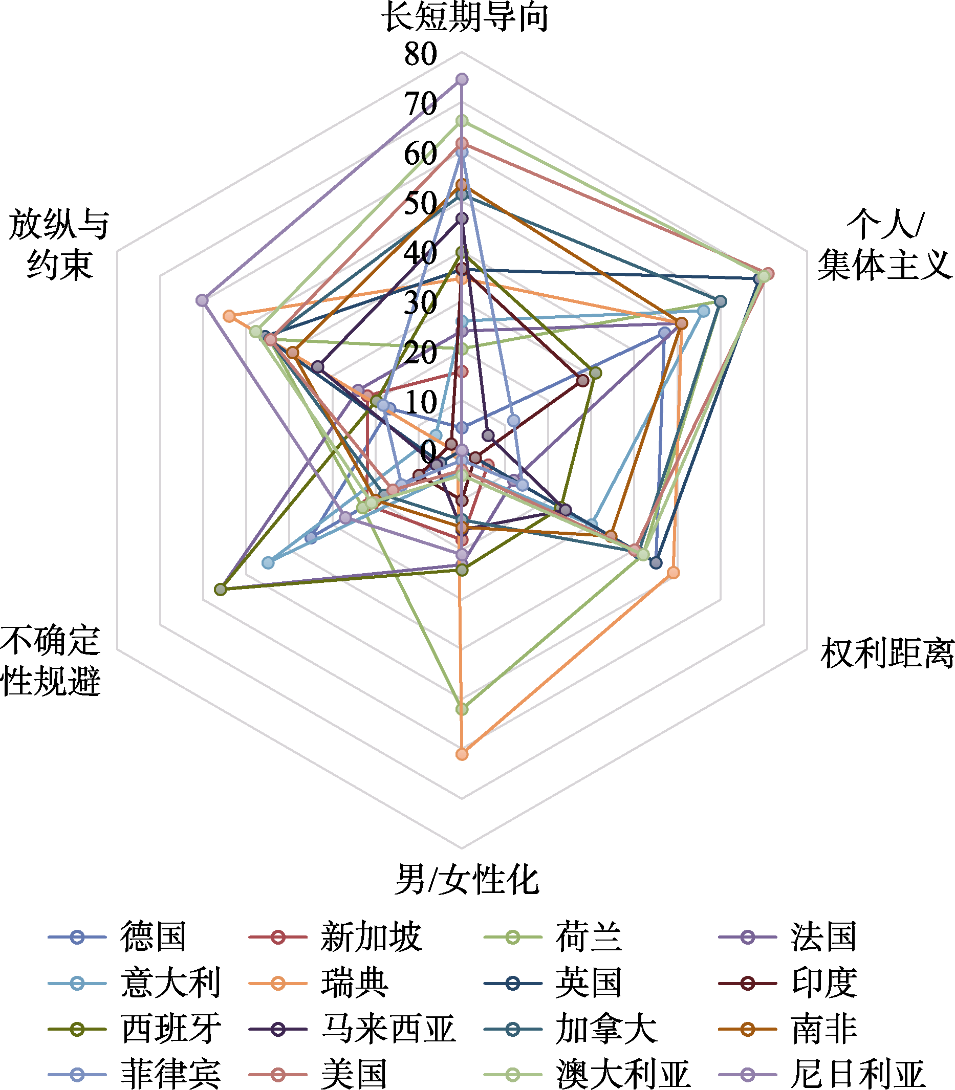 | 图3 根据霍夫斯泰德6个文化维度指标绘制雷达图 注:中国的矢量距离定义为0点。越远离0点, 表明离中国文化的距离越远。 |