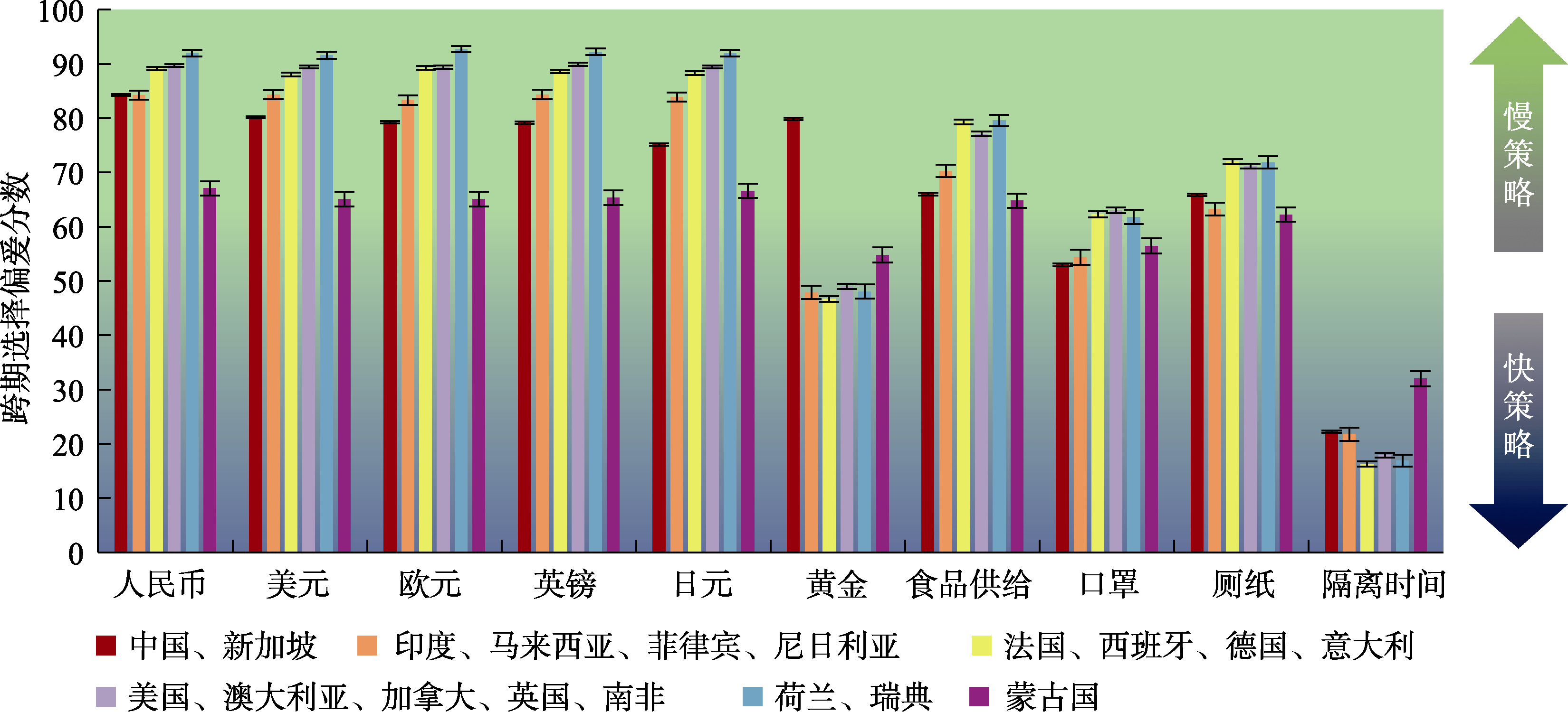 | 图6 五类国家以及蒙古国受测者(N = 26, 355)对6种全球主要货币以及4种疫时通货的折扣率排序 注:纵轴单位(0~100)。0~50(蓝色区间)表示偏爱先得后失的选项, 数值越小, 表示折扣率越大、越偏爱快策略; 50~100(绿色区间)表示偏爱先失后得选项。数值越大, 表示折扣率越小、越偏爱慢策略; 50表示既不偏好先失后得也不偏好先得后失选项。隔离时间选项因获得(gain)为免于隔离天数; 损失(loss)为隔离天数, 故反向计分。图中误差线为标准误线。 |