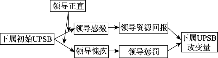 领导资源回报增加下属后续的UPSB。深受“上尊下卑”传统思想的影响, 中国社会历来看重来自上位者的恩惠。倘若上位者对下位者给予某种恩惠或好处, 则会在下位者心目中留下积极烙印, 使下位者对上位者产生强烈的回馈义务(翟学伟, 2007)。在领导−下属互动情境下, 当下属得到了领导的关怀照顾与福利奖赏时, 会产生回报义务感(Zhang et al., 2015)。在此情况下, 下属会尽一切可能来回馈领导, 即使此类行为可能有违道德规范, 但只要能够使领导获益, 下属依旧会义无反顾地执行(钟熙, 王甜, 2019)。此外, 奖励某种行为, 能够使此种行为得到进一步加强。在下属做出UPSB后, 若领导为下属提供资源回馈, 这将使下属认为UPSB被默许、鼓励以及带来奖赏。在此种理解下, 下属为了继续获得奖赏, 会“理直气壮”地做出更多UPSB。据此, 提出以下假设: