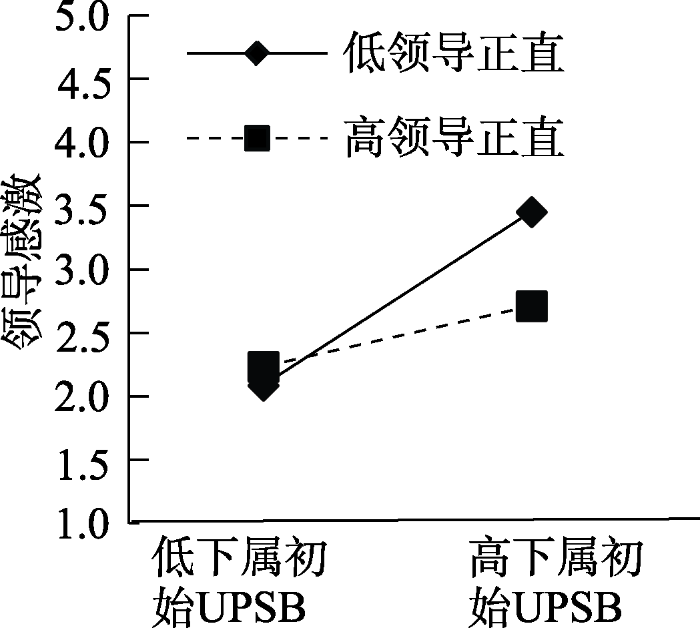 整合上述假设, 领导正直调节“下属初始UPSB—领导感激—领导资源回报—下属UPSB改变量”的链式中介关系。当下属做了UPSB后, 低正直的领导由于低道德要求而蒙蔽自己的伦理判断, 内心的受益感知重于道德标准, 从而产生感激之情。在感激之情的驱动下, 领导将更多资源回馈给下属。领导的资源回报释放了“默认”、“许可”甚至“鼓励”下属UPSB的信号, 使下属做出后续UPSB。相反, 高正直的领导更加看重道德准则(Shao, 2019), 即使下属UPSB有利于领导, 但只要该下属违反了道德规范, 领导不会做出损人利己之举, 从而减少了对下属的资源回报。当下属做出UPSB却没得到领导积极报答时, 便会意识到纯粹考虑领导利益的“徇私”行为得不到领导的认可, 故后续工作中减少UPSB。据此, 提出以下假设:
