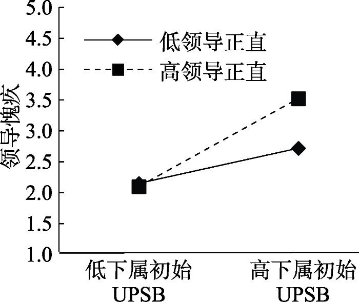 即使没有实施非伦理行为, 当个体从他人非伦理行为中获益或与行为实施者有直接联系时, 也会产生愧疚(Rothschild et al., 2012; Barclay et al., 2005; Brockner et al., 1986; Krehbiel & Cropanzano, 2000; Weiss et al., 1999)。虽然领导没有做出非伦理行为, 但下属UPSB是为了领导的利益, 会将领导牵扯进非伦理事件之中。当高正直的领导作为非伦理行为的受益方时, 更会因此而产生愧疚。此外, 在职场上, 领导有义务和能力制止下属的非伦理行为; 高正直的领导会因自己没能有效控制下属的UPSB而认为自己失职, 从而产生愧疚。相反, 低正直的领导对伦理规范的重视程度不高, 更少因为下属UPSB而感到愧疚。