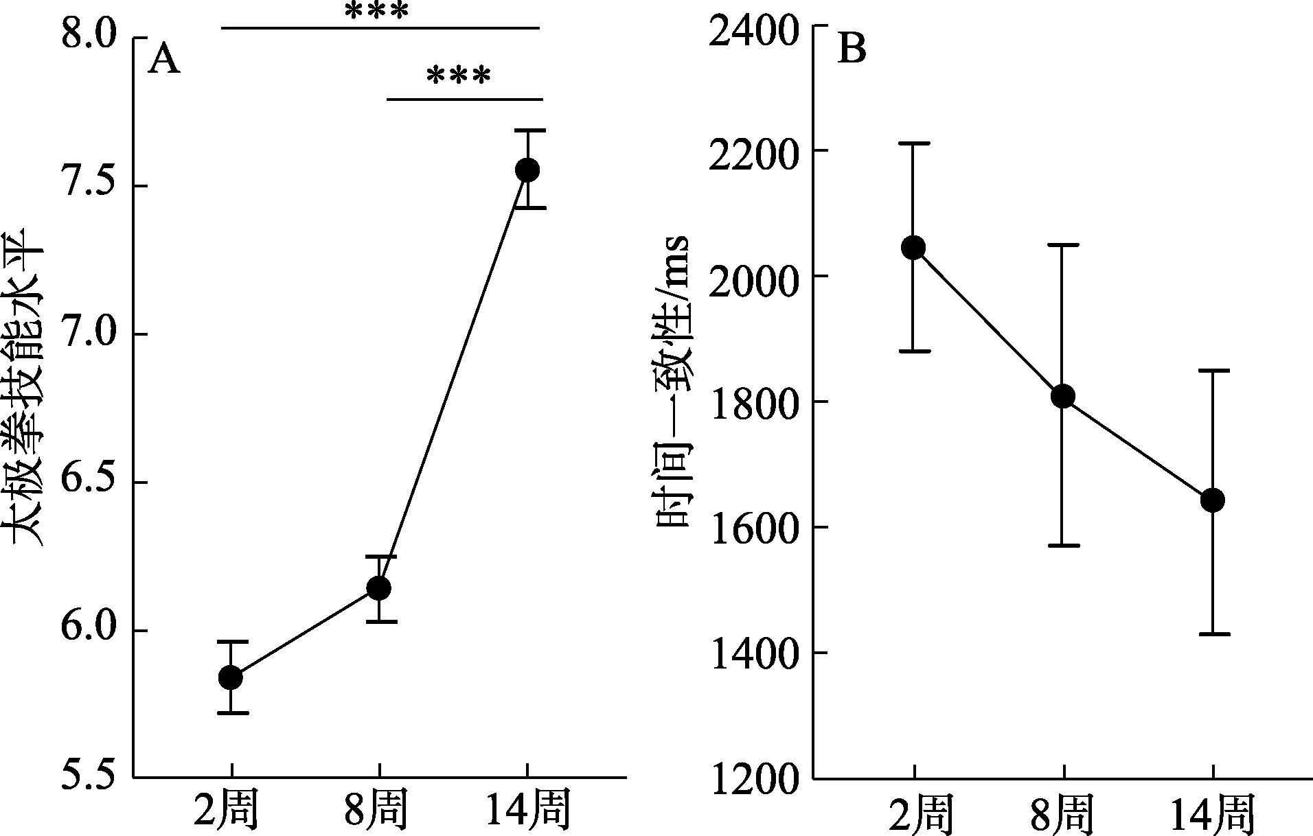 | 图3 不同时间(2周、8周和14周)技能水平(A)和时间一致性(B)的差异 注:**代表p < 0.01, ***代表p < 0.001, 误差线表示平均值的标准误差(standard error, SE), 事后多重比较采用Bonferroni校正。 |