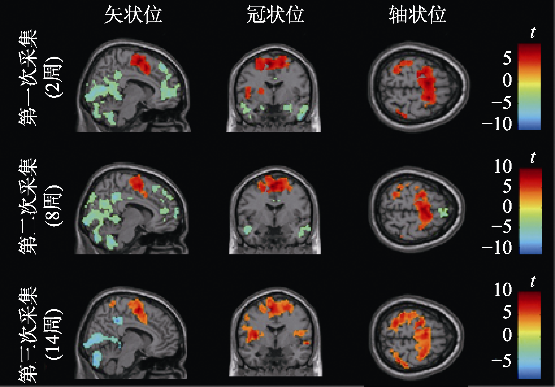 | 图4 不同时点运动表象激活的脑区 注:校正阈值为体素水平未校正, p < 0.001, 团块水平的FWE校正, p < 0.05; 第一次采集体素数量 > 147, 第二次采集体素数量 > 119, 第三次采集体素数量 > 55。 |