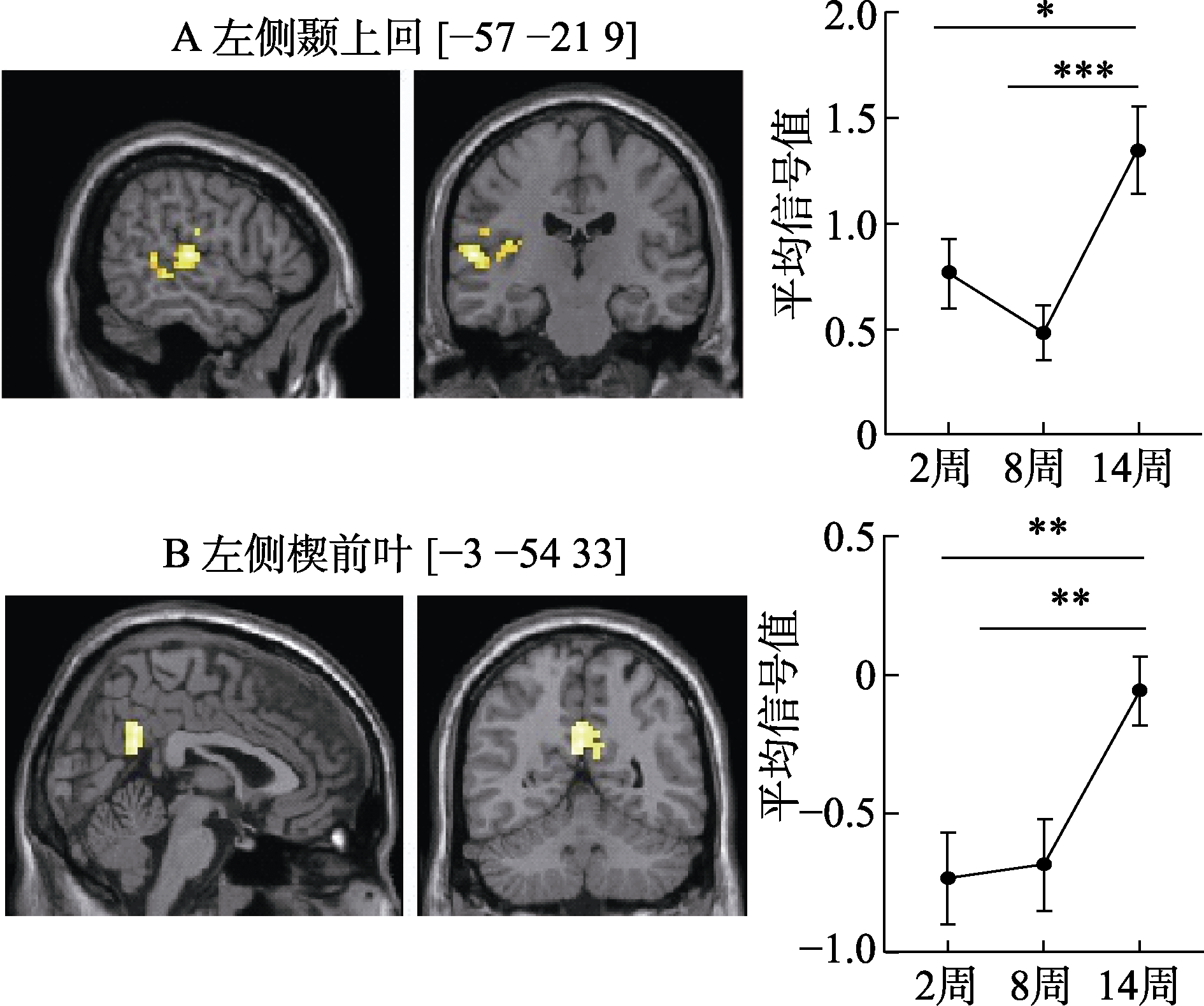 | 图5 不同时点左侧颞上回(A)和左侧楔前叶(B)的平均信号值差异 注:左列为交互脑区的矢状面和冠状面, 右列分别为以峰值点坐标为球心、6 mm为半径所作球形ROI 的平均信号值的事后检验, *代表p < 0.05, **代表p < 0.01, ***代表p < 0.001, 误差线表示平均值的标准误差(standard error, SE), 事后多重比较采用Bonferroni校正。 |